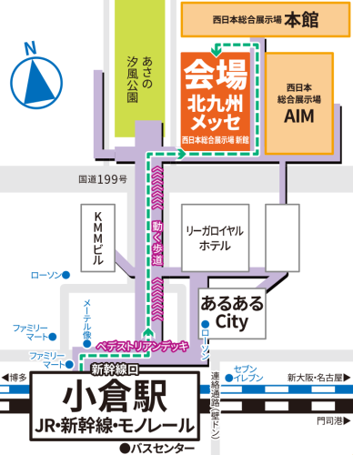 会場となる北九州メッセ(旧西日本総合展示場新館)は、小倉駅から徒歩5分というたいへん便利な立地です。駅から会場までは屋根付きの歩道橋で結ばれ、動く歩道も整備されています。